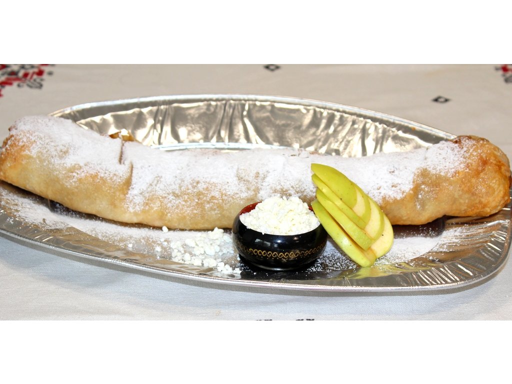 Ručne ťahané cesto je tenké a obalené okolo bohatej domácej plnky. Vďaka jablkám štrúdľa nevysychá, zostáva vláčna a chutí ako od babičky.
